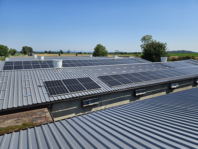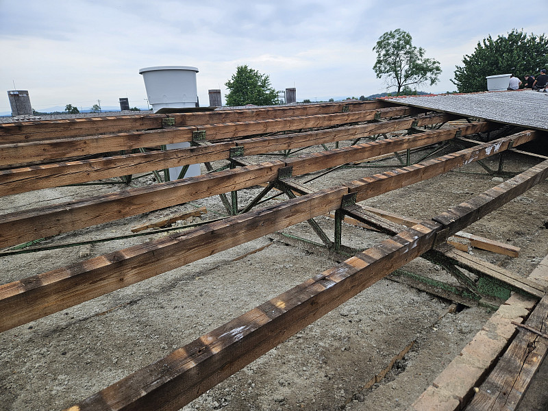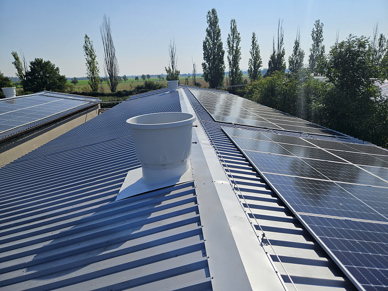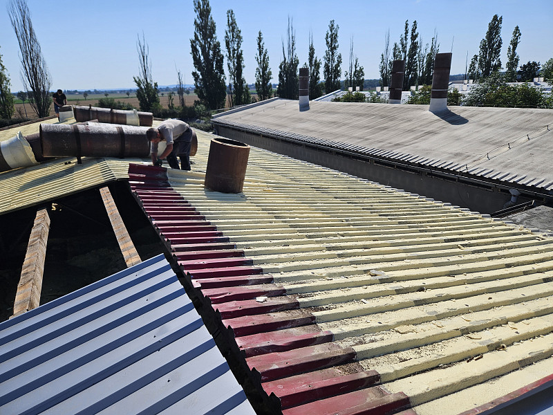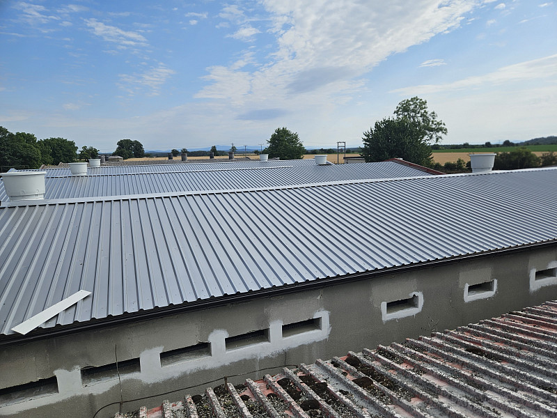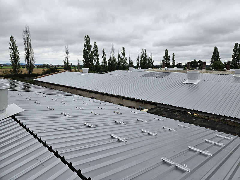 Výměnu střešních krytin na deseti halách výkrmu prasat Poctivá izolace realizovala od července do září 2023. Jednotlivé střechy nám investor uvolňoval dle vyskladnění jednotlivých hal. Společně s výměnou střešních krytin probíhala rekonstrukce ventilačního systému. Proto bylo důležité počkat až budu jednotlivé haly bez zvířat, aby se dala začít rekonstruovat vzduchotechnika včetně ventilačních komínů, které prostupují střešní krytinou. Celková výměra všech střech činila 3 300 m2. Investor střešní krytinu měnil z důvodu přípravy na montáž fotovoltaické elektrárny – FVE. Proto byla zvolena střešní plechový krytina o síle plechu 0,7 mm. Tloušťka plechu 0,7 mm již zaručuje při šetrném pohybu montážních dělníků FVE, že nebude nová střecha ihned zlikvidována. Stávající střešní krytina z hliníkového plechu nebyla v takové kondici, aby vydržela dalších 20 let, což je plánovaná životnost FVE. Společně s výměnou střešní krytiny Poctivá izolace měnila kompletní dešťový systém. Posledním pracovním krokem na střechách ve Valovicích byla dodávka a montáž nového hromosvodového vedení včetně zajištění nové revize. Veškeré práce na střechách probíhaly v koordinaci s dodavatelem ventilačního systému, což byla společnost FARMTEC Litomyšl. Poctivá izolace celou zakázku zvládla provést v plánovaném čase a ve špičkové kvalitě.