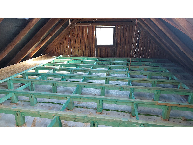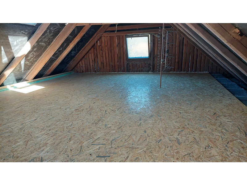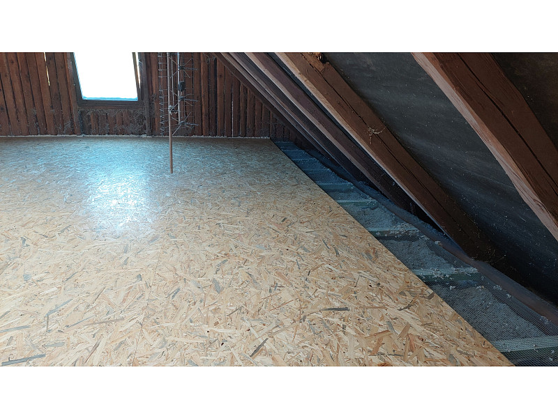 Při zateplování chalupy s trámovým stropem bylo třeba na stropě domu zhotovit podlahový systém. Poctivá izolace má svůj vlastní patentovaný podlahový systém zvaný DPS – distanční podlahový systém. Jedná se o velmi variabilní podlahový systém, který je určen pro zateplení stropů s pomocí technologie foukané izolace. Základem je rošt, který vytvoří velmi pevnou a zároveň i velice stabilní konstrukci, do které se následně aplikuje jakákoliv vrstva foukané izolace. V tomto případě vrstva celulózové izolace vysoká 28 cm. Po nafoukání izolačního materiálu se celá konstrukce zaklopí OSB deskami, které tvoří pochozí vrstvu. Jedná se o skvělý způsob, jak docílit dokonalého zateplení stropu a zároveň zachovat pochůznost půdy. Poptejte si zateplení od Poctivé izolace. V rámci našeho špičkového zákaznického servisu Vám rádi se vším poradíme a pomůžeme!
