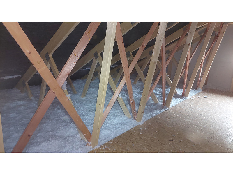 Na začátku října 2022 zrealizovala Poctivá izolace zateplení stropu novostavby rodinného domu v Jasence. Šlo o novostavbu dřevostavby typu bungalov se sedlovou střechou, vazníkovou konstrukcí a s lehkými sádrokartonovými stropy. Foukaná izolace se aplikovala na již stávající vrstvu vaty a rovněž do podbití. Jako materiál byla zvolena skelná minerální izolace Supafil loft od společnosti Knauf, kterou náš profi tým proškolených pracovníků nafoukal ve vrstvě vysoké 400 mm. Na stropě domu tak vznikla celistvá dokonale izolující vrstva bez jakýchkoliv tepelných mostů. Poptejte si zateplení stropu od Poctivé izolace i Vy.