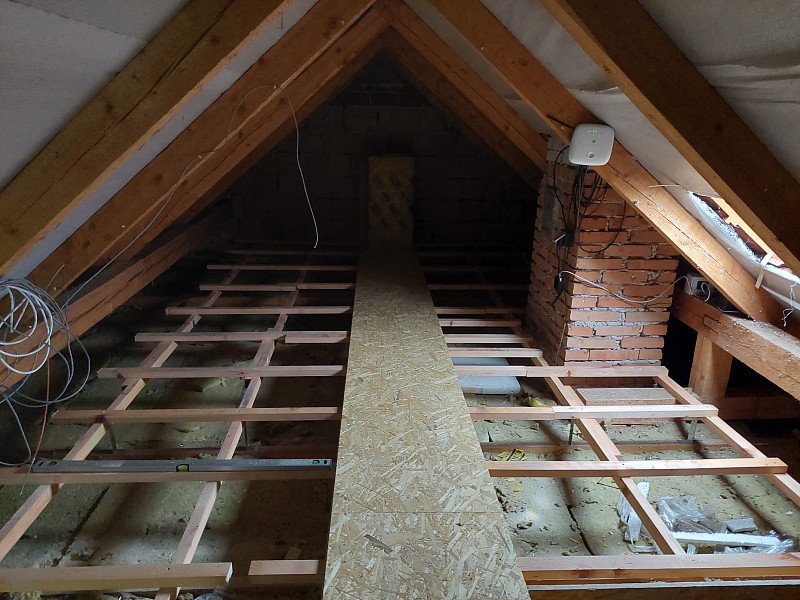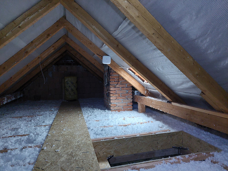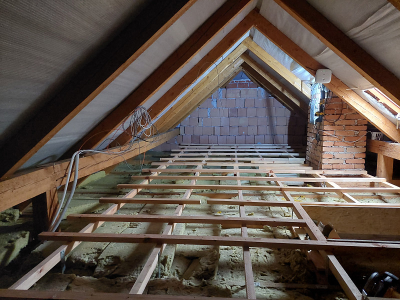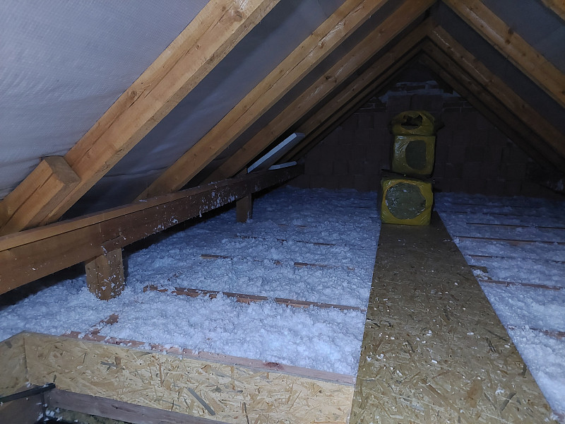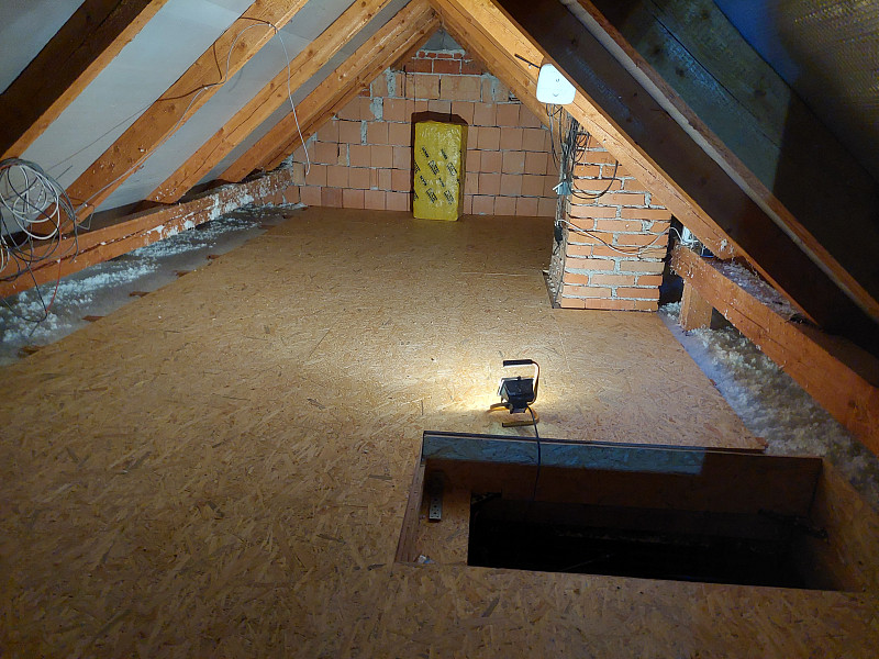 Na trámovém stropě stávajícího rodinného domu se nacházela 10-20 cm vysoká vrstva deskové izolace, která sahala asi 3 cm pod horní hranu trámu. Bylo třeba provést doplnění této izolační vrstvy a rovněž vytvoření nové podlahy. Poctivá izolace má svůj vlastní patentovaný podlahový systém, který nazýváme DPS neboli distanční podlahový systém. Jedná se o podlahový systém s vysokou variabilitou výstavby roštů. Zjednodušeně jde o skládačku o 3 komponentech – dřevěné špalíky s křížovou drážkou, nosná prkna a střešní latě. Celý tento systém pak vytvoří rošt pro aplikaci foukané izolace. Výšku vrstvy pak určuje výška dřevěných špalíků. Pochozí vrstvu celého podlahového systému pak tvoří OSB desky. Na zateplení trámového stropu rodinného domu v Nymburku byla použita skelná minerální izolace Supafil loft, mezi jejíž hlavní výhody patří zejména její nesléhavost, prodyšnost, nehořlavost či nízká objemová hmotnost. Poptejte si zateplení stropu od Poctivé izolace i Vy a staňte se dalším z řady našich spokojených zákazníků.