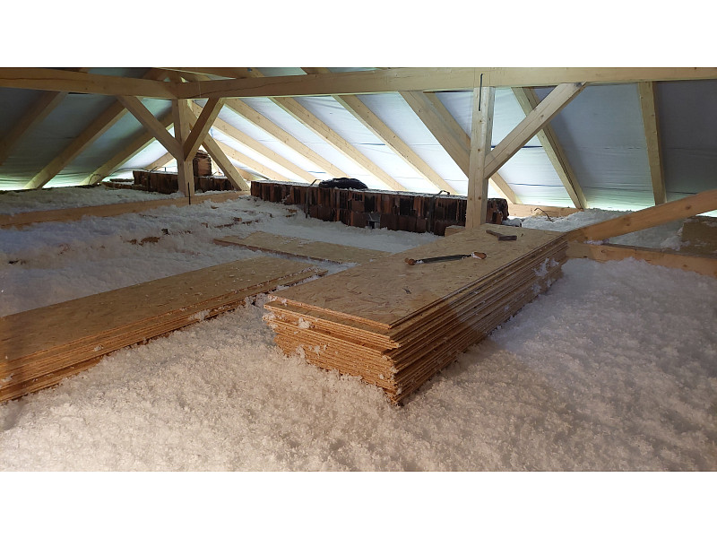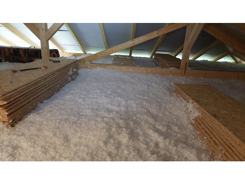 V rodinném domě v Puklicích byla po vyhoření zhotovena nová trámová konstrukce krovu a Poctivá izolace dostala za úkol dům opět zateplit. Tým pracovníků Poctivé izolace zhotovil celkem dvě různě vysoké tepelně izolační vrstvy. Strop v obývacím pokoji byl asi o 10 cm výše, a proto bylo třeba vytvořit náběh. Na straně domu, kde se nacházel obývací pokoj se nafoukala vrstva izolace vysoká 35 cm a na straně u vchodu naopak vrstva vysoká 27 cm. Přesto na stropě domu vznikla dokonale izolující vrstva, která zajistí dokonalý tepelný komfort v domě. Jako materiál byla zvolena skelná minerální izolace Supafil loft od společnosti Knauf, která se skvěle hodí na lehké sádrokartonové stropy díky své nízké objemové hmotnosti. Poctivá izolace nabízí všem svým zákazníkům celkem 5 druhů izolačních materiálů. Krom skelných minerálních izolací jsou to ještě minerální čedičové izolace, celulózové neboli papírové izolace, dřevovláknité izolace a rovněž izolace polystyrénové. S výběrem toho pravého izolačního materiálu pro Váš typ konstrukce Vám v Poctivé izolace rádi pomůžeme a poradíme. Vyzkoušejte si nás. Poctivá izolace je tu pro Vás.